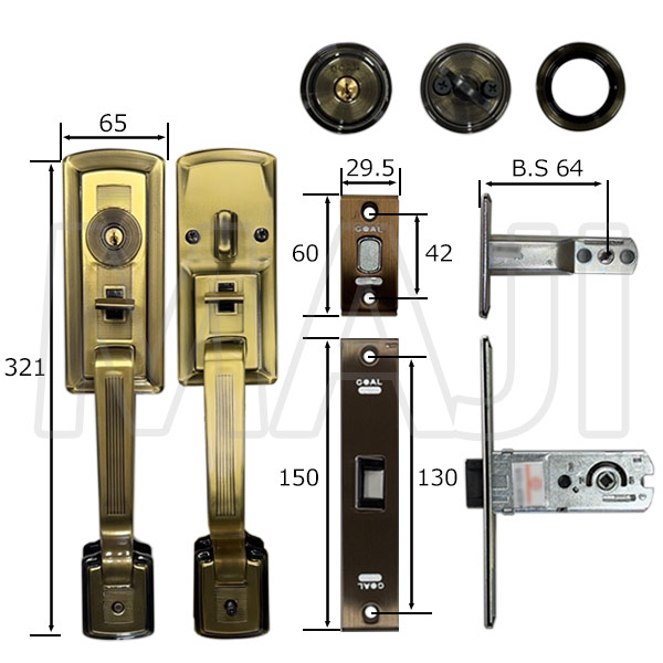 HHJ-0014は外側ハンドル・主錠補助錠シリンダーのみのセットになります。(内部ハンドル、サムターン、ロックケースは付属しません。)