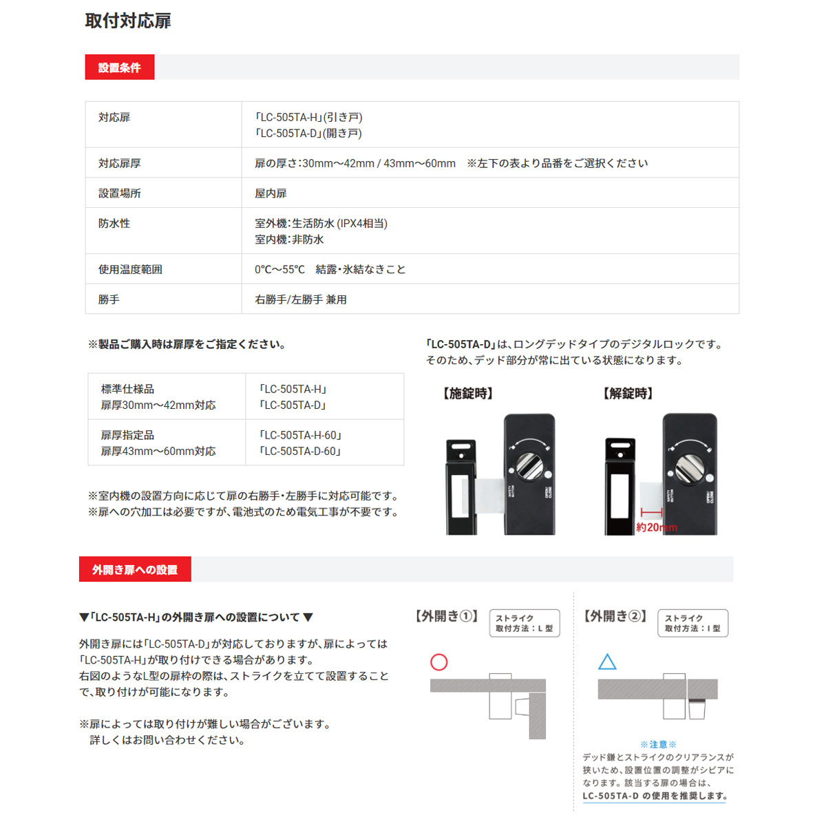 | LC-505TA-H60 | ・引き戸対応(戸先) ・扉厚指定 ・対応戸厚:43ミリ〜60ミリ | |