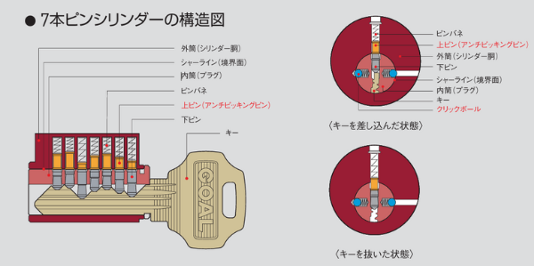 ■ 高精度7本ピンと、パラセントリック・キーセクションや上ピンすべてのアンチピッキングピンにより、ピッキングなどの不正解錠は殆ど不可能です。