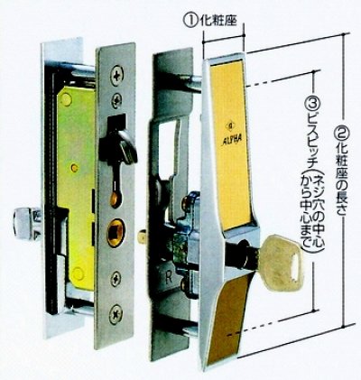 型式:召し合せ 内外錠 / 戸先 内外錠 締り:カマ 内部操作:スライド式 フロントサイズ:召合せ 外 L105×W36 内 168×36 戸先 L147(102)×34(17) ビスピッチ:召合せ124 戸先120(85) (ビスピッチとは、ビス穴のセンター〜センターまでです。) ドア厚:30ミリ | |