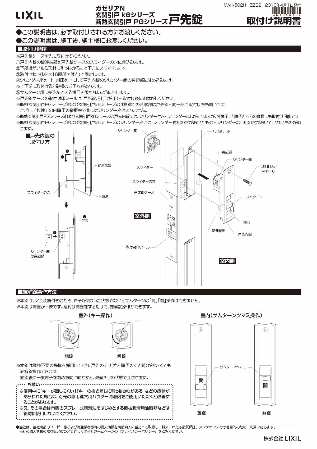 内容物:錠セット×1、キー×5、工事用キー×3、取付ネジセット×1