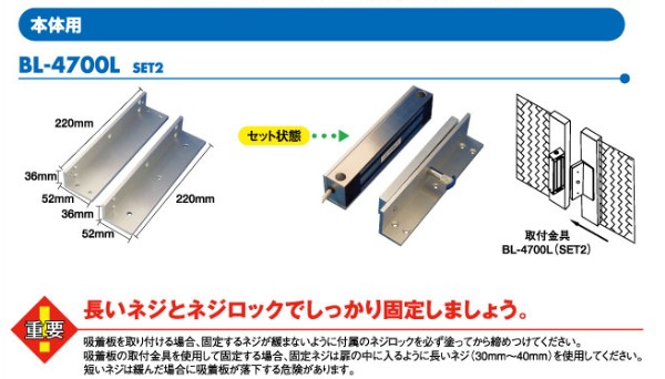 BL-4700L吸着板側はLC-4700DLSS吸着板を取り付けるL型金具です。主に横引き扉の扉枠へ吸着板を取り付ける場合に使用します。取付方法は以下の通りです。